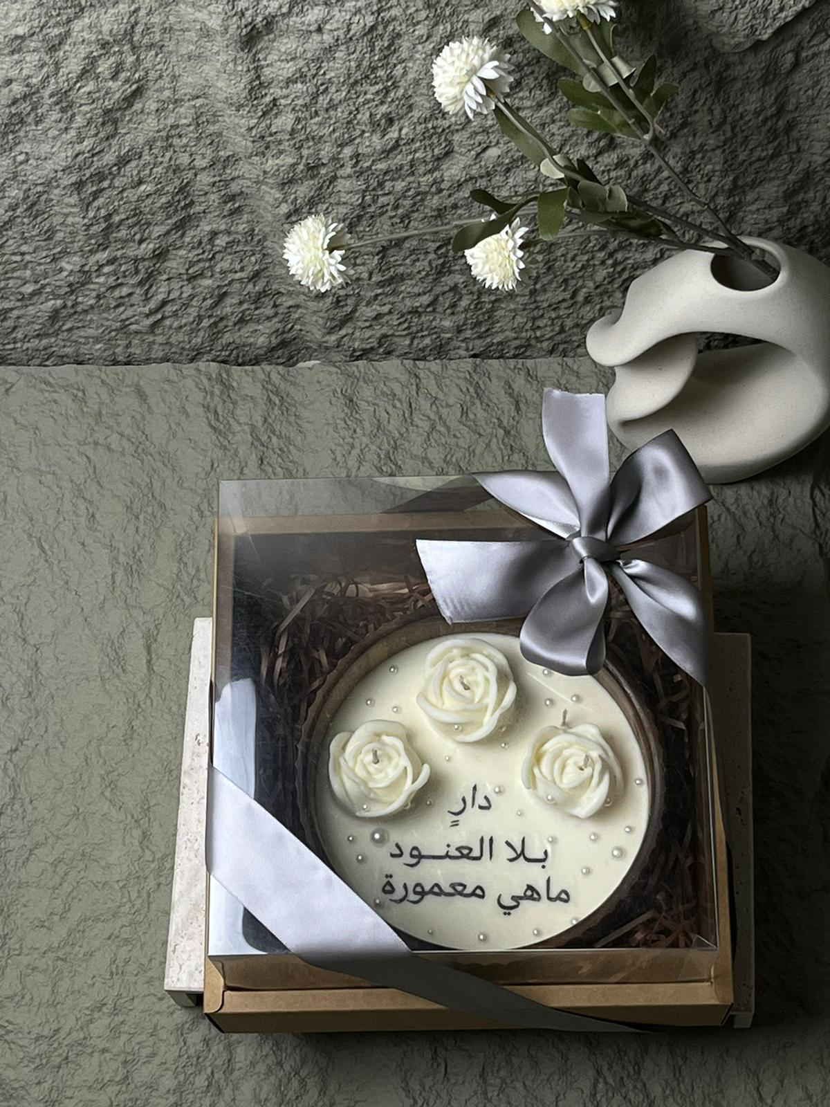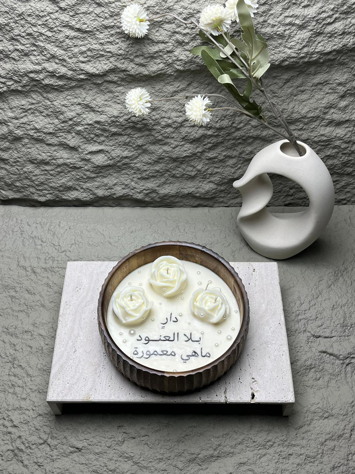 This elegant piece is more than just a candle—it’s a poetic blend of art, tradition, and design. Handcrafted with attention to detail, the candle is housed in a round rustic wooden bowl and topped with intricately molded white wax roses, giving it a refined and serene presence.